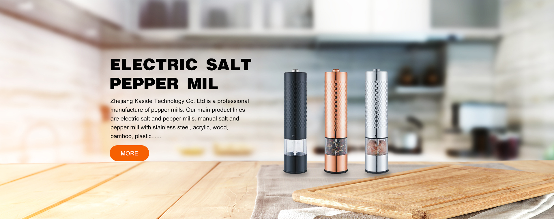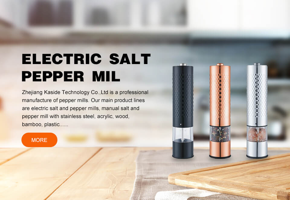 Zhejiang Kaside Technology Co.,Ltd is a professional manufacture of pepper mills. Our main product lines are electric salt and pepper mills, manual salt and pepper mill with stainless steel, acrylic, wood, bamboo, plastic......